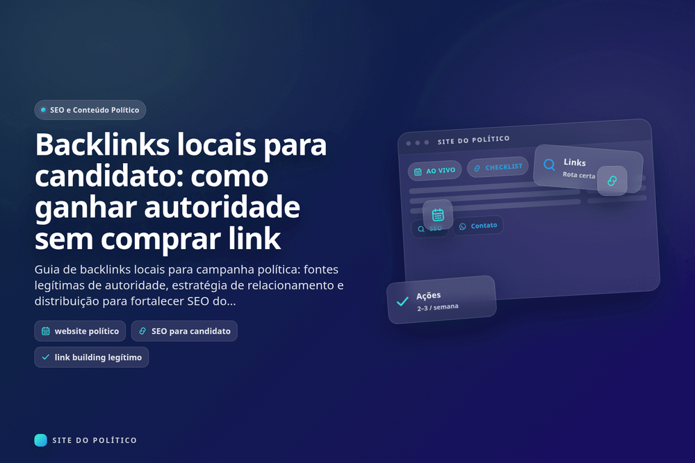 Atalho do cluster: este conteúdo é um artigo satélite do guia pilar Website político e campanha política: guia pilar completo de SEO, tráfego pago e conversão. Para avançar nesta etapa, leia também SEO para candidato: como aparecer no Google quando pesquisarem seu nome e Como criar um site para candidato em 5 minutos: estrutura mínima que converte (vereador e deputado).