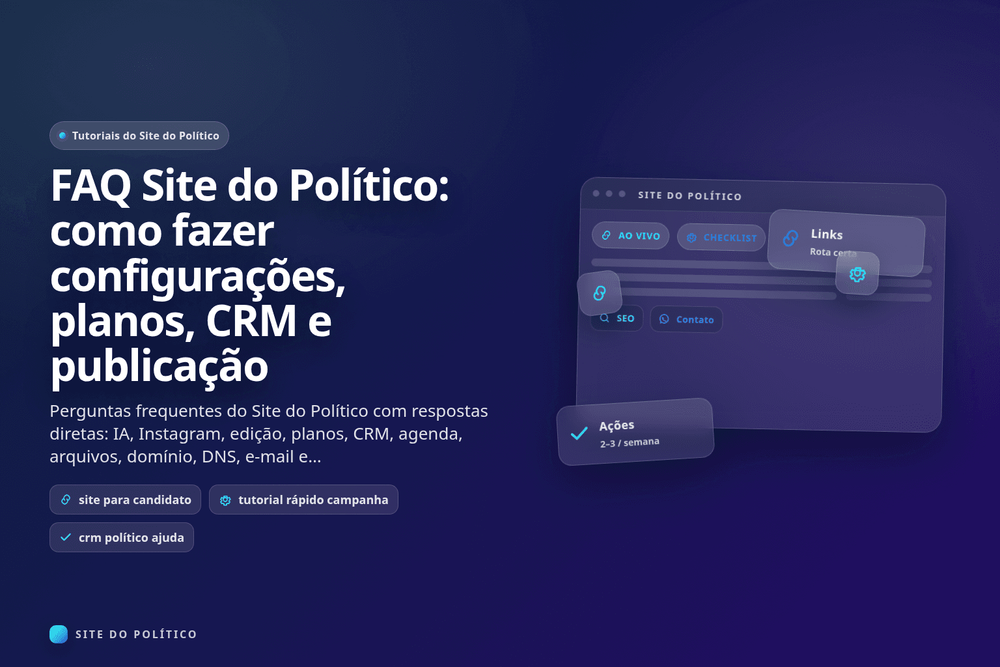 Perguntas frequentes do Site do Político com respostas diretas: IA, Instagram, edição, planos, CRM, agenda, arquivos, domínio, DNS, e-mail e publicação.