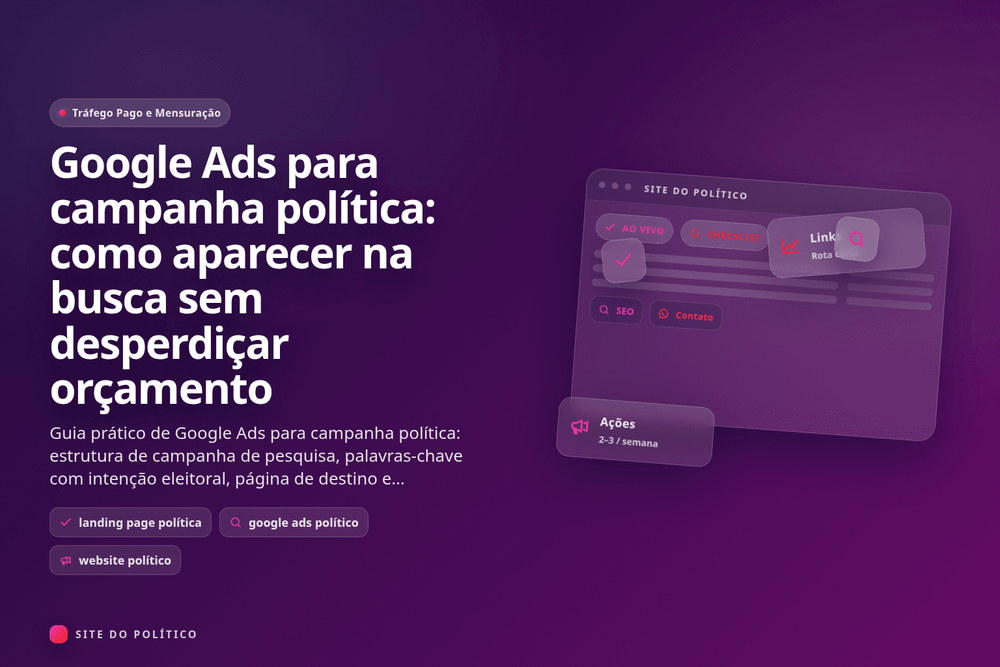 Atalho do cluster: este conteúdo é um artigo satélite do guia pilar Website político e campanha política: guia pilar completo de SEO, tráfego pago e conversão. Para avançar nesta etapa, leia também Impulsionamento na internet: guia simples para não cair em irregularidade na campanha e Páginas essenciais para anúncios: landing page de doação, voluntários e WhatsApp.