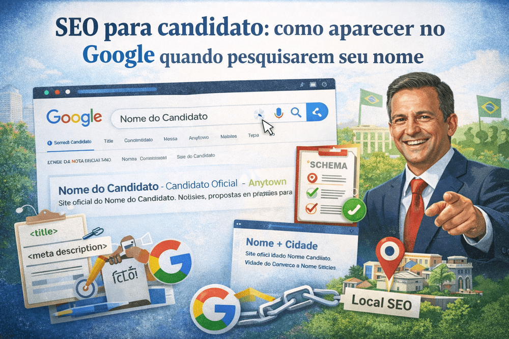 Guia prático de SEO político para ranquear quando pesquisarem seu nome: como acertar título e meta description, usar schema (ProfilePage/Organization/Article), criar a página “Nome + Cidade”, ganhar backlinks locais e garantir velocidade (Core Web Vitals).